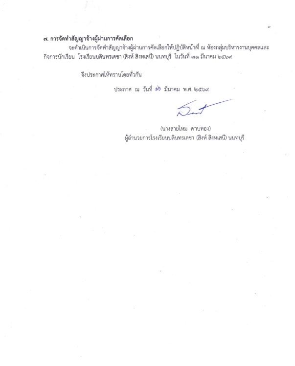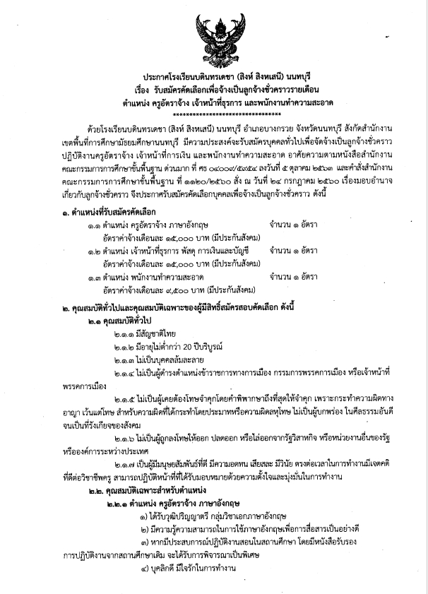 รับสมัครคัดเลือกเป็นลูกจ้างชั่วคราว ตำแหน่ง ครูอัตราจ้าง เจ้าหน้าที่ธุรการ และพนักงานทำความสะอาด