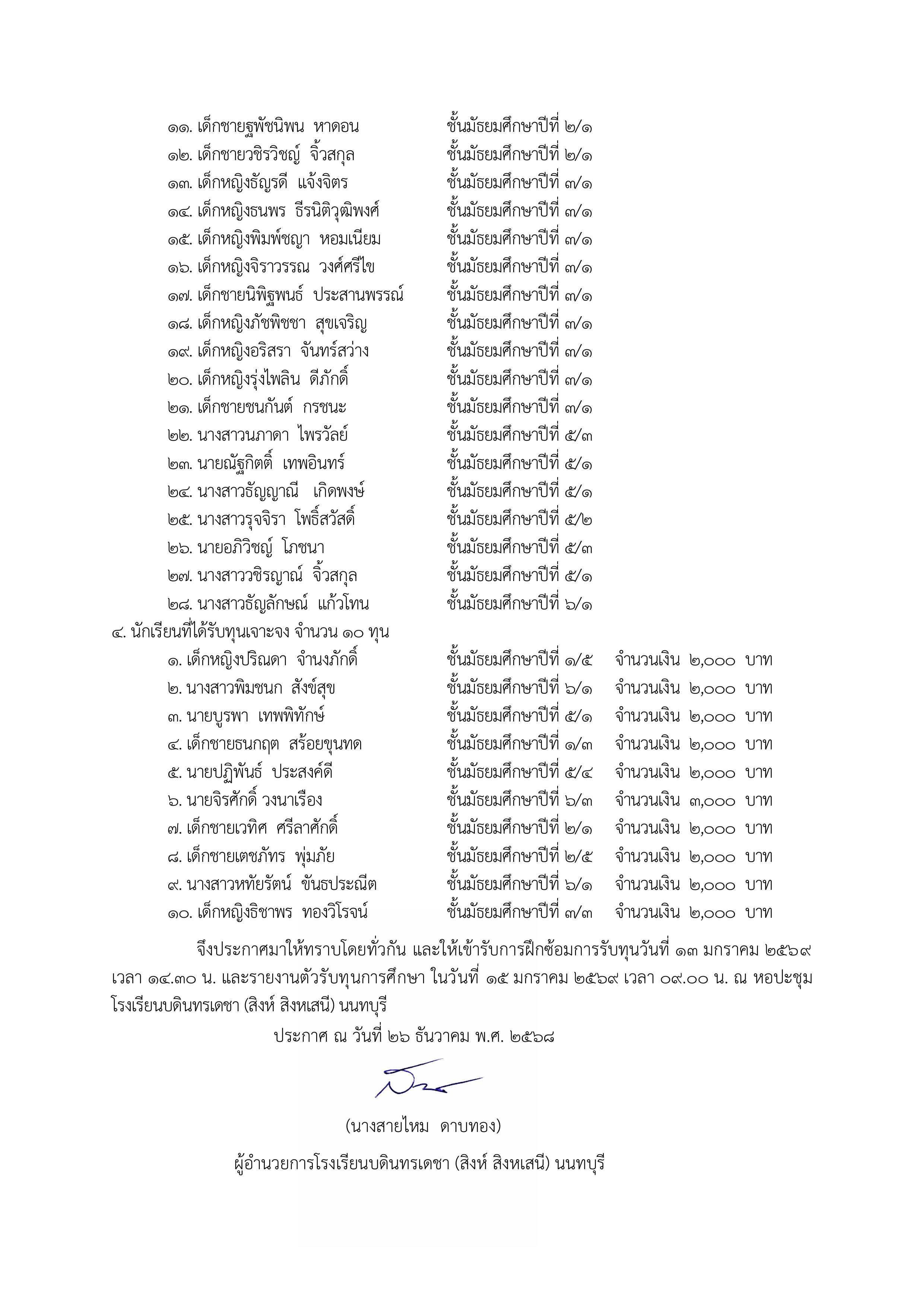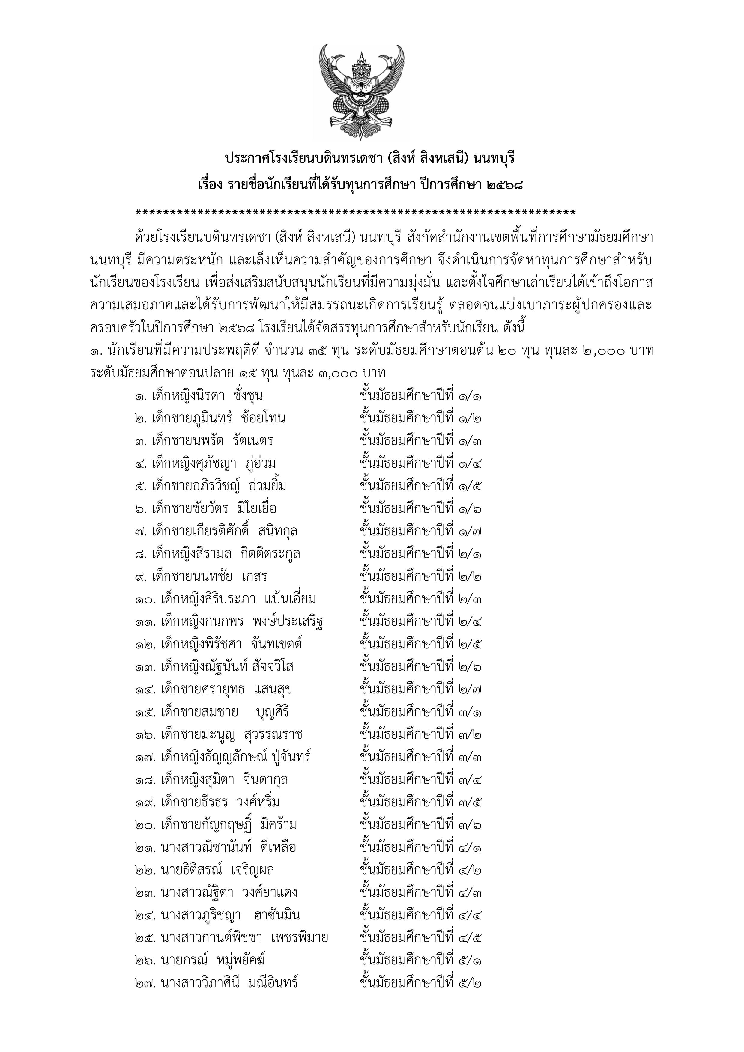 รายชื่อนักเรียนที่ได้รับทุนการศึกษา ปีการศึกษา 2568