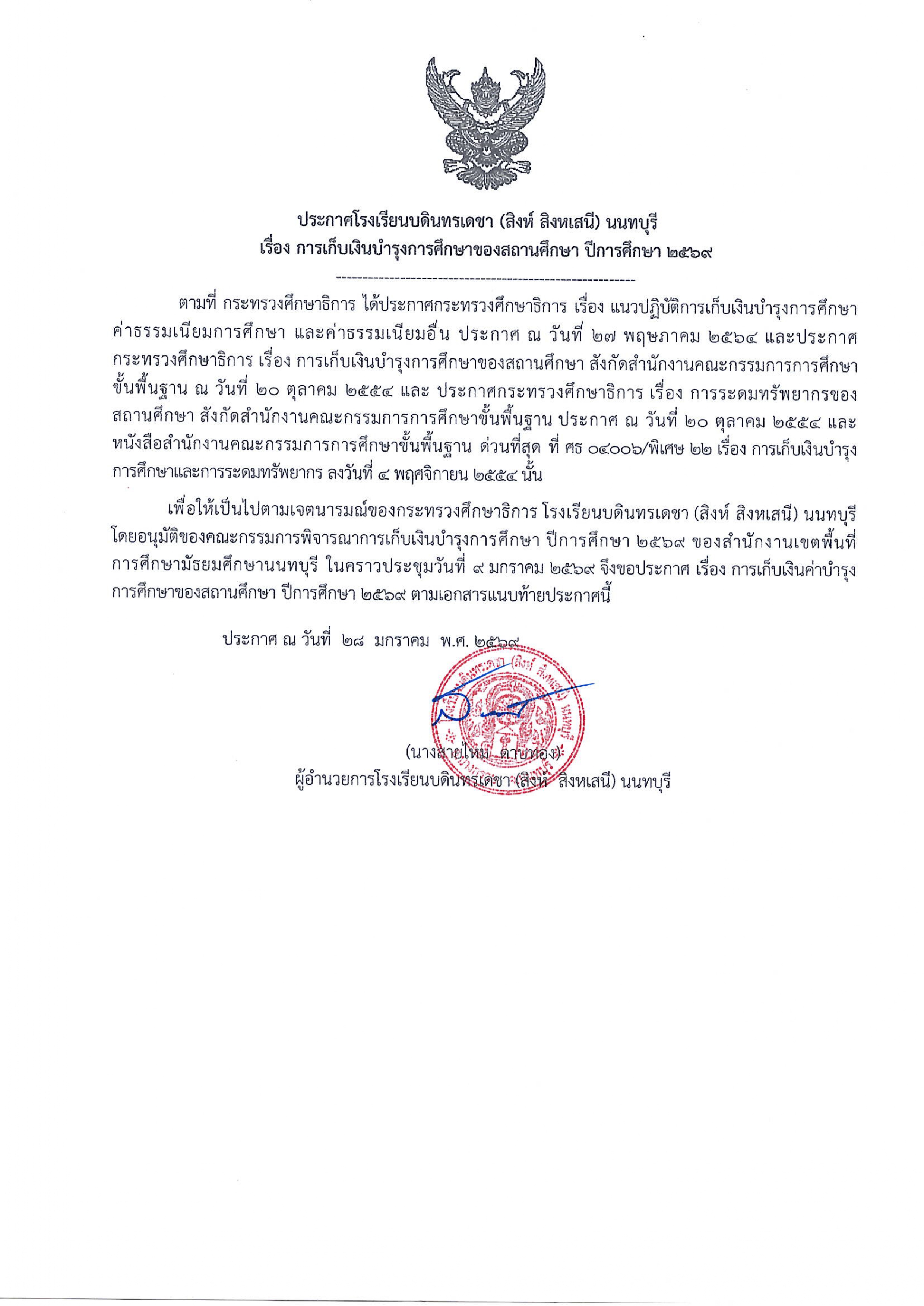 การเก็บเงินบำรุงการศึกษาของสถานศึกษาประจำปีการศึกษา 2569