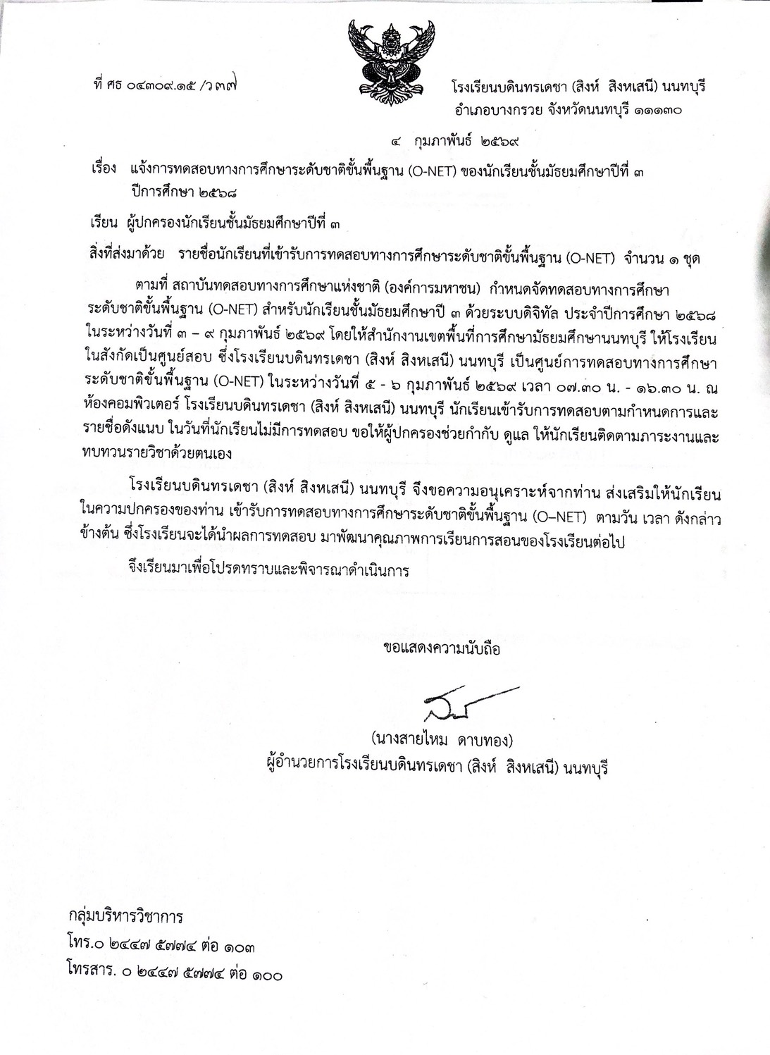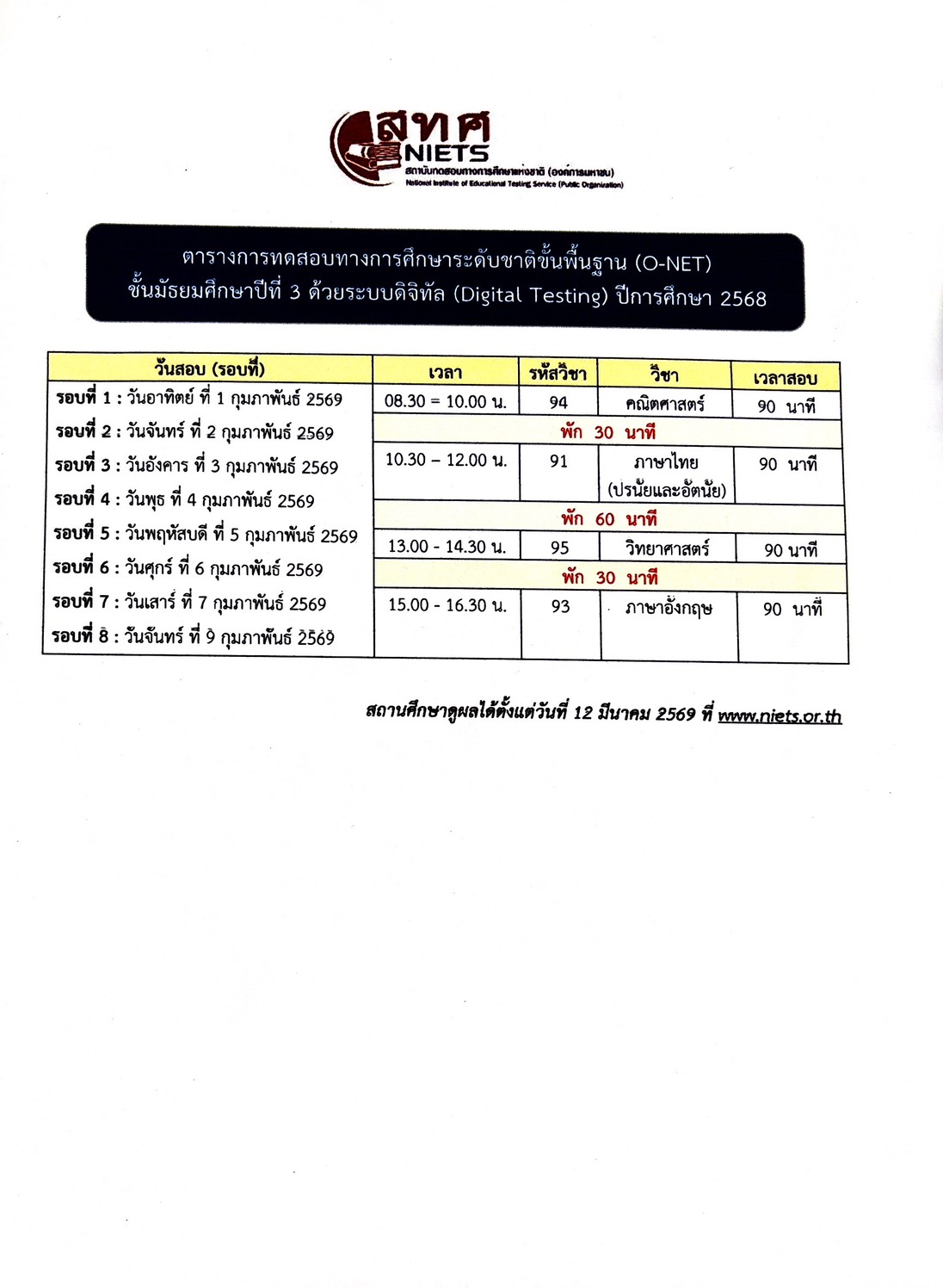 แจ้งการทดสอบทางการศึกษาระดับชาติขั้นพื้นฐาน (O-NET) ชั้นมัธยมศึกษาปีที่ 3 ปีการศึกษา 2568