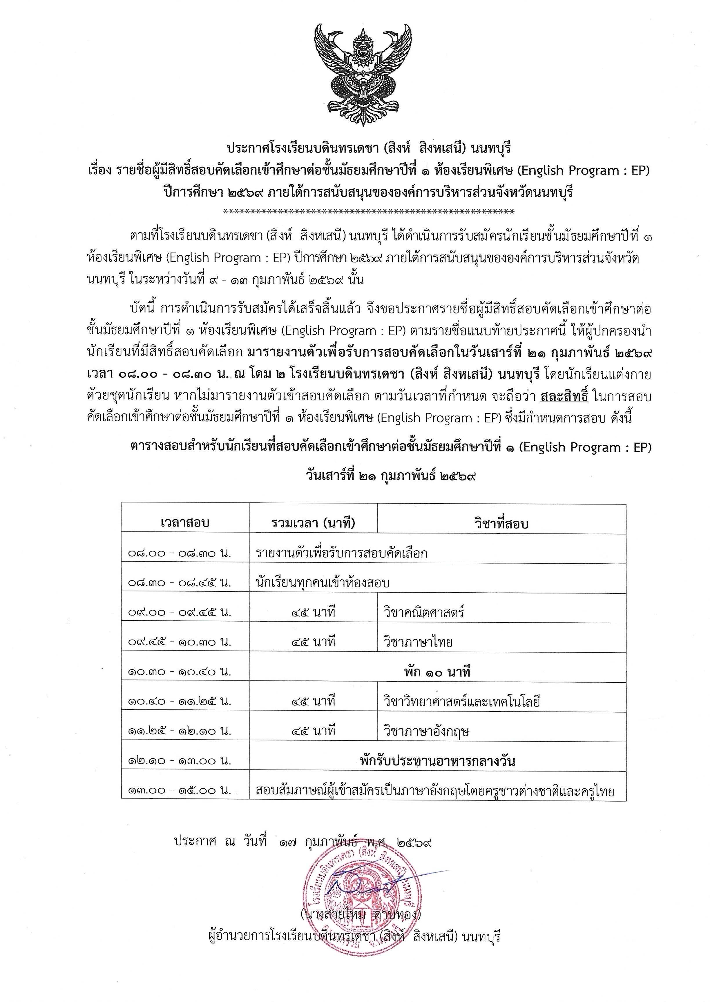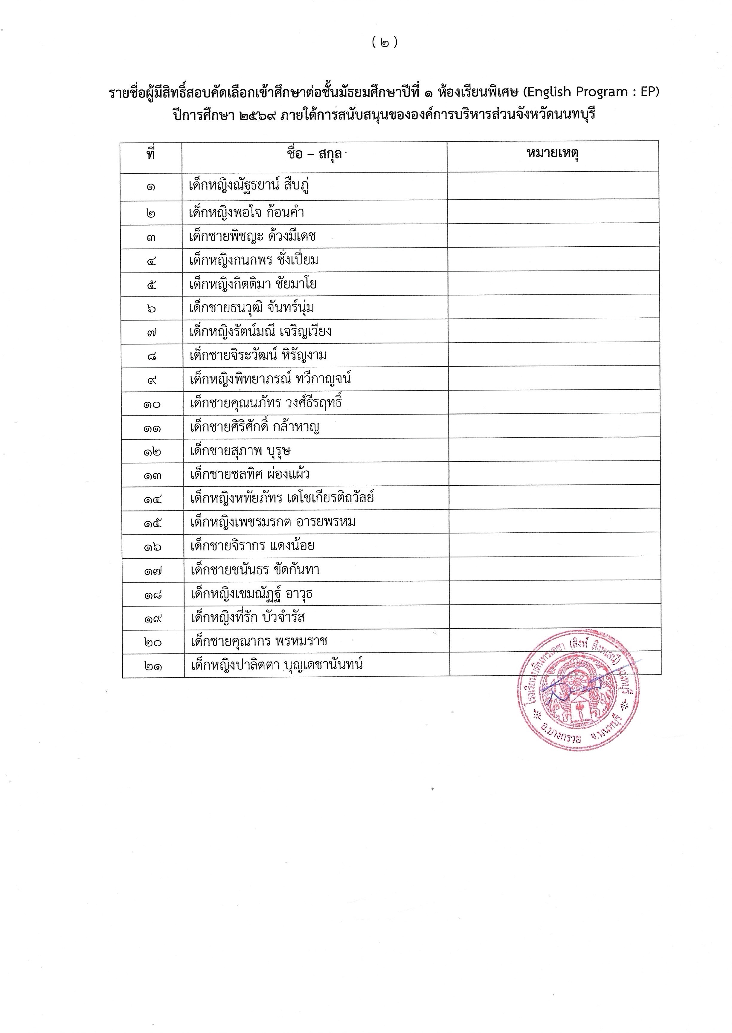 รายชื่อผู้มีสิทธิ์สอบคัดเลือกเข้าศึกษาต่อชั้น ม.๑ ห้องเรียนพิเศษ (English Program : EP)