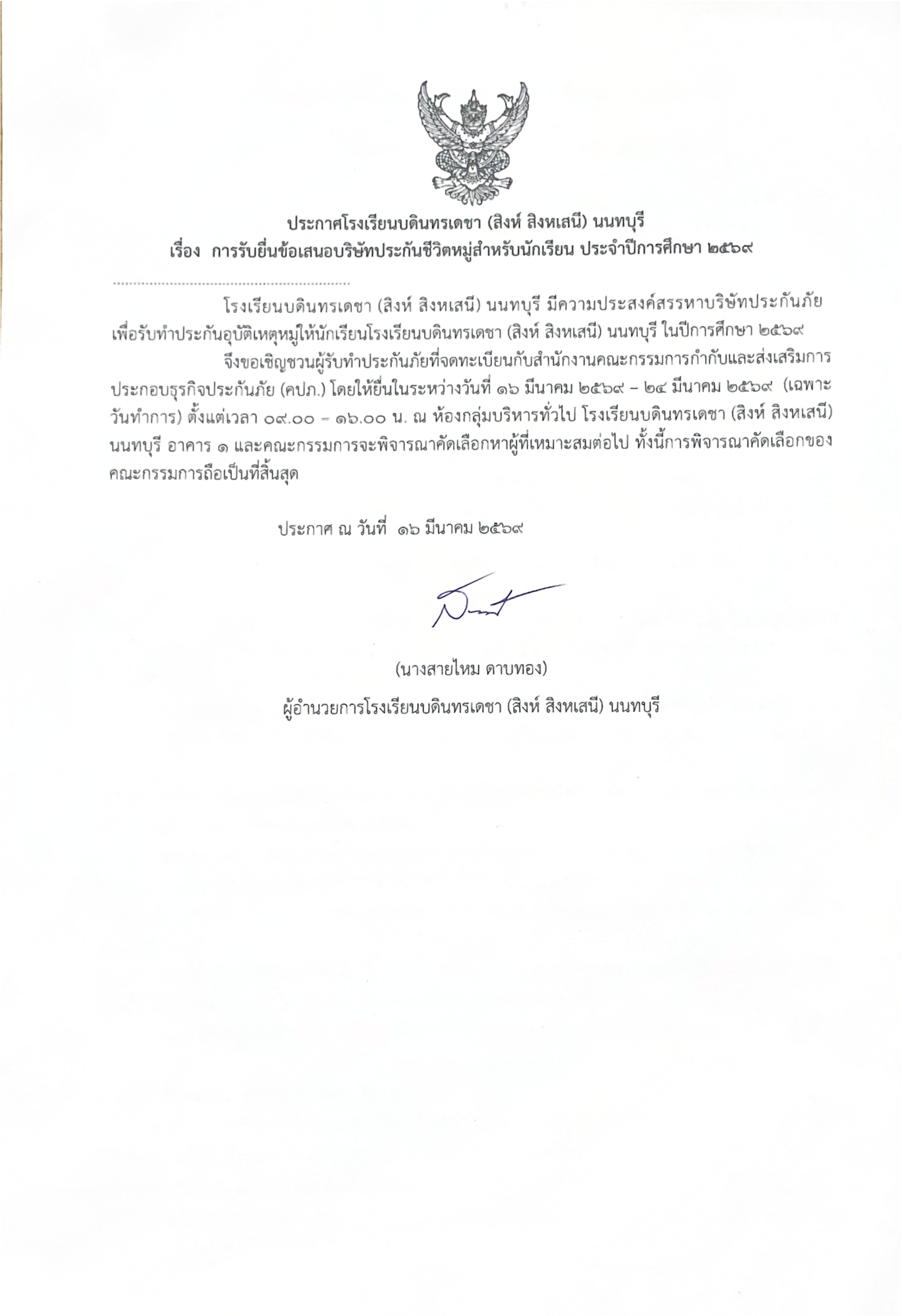 การรับยื่นข้อเสนอบริษัทประกันชีวิตหมู่สำหรับนักเรียน ประจำปีการศึกษา 2569