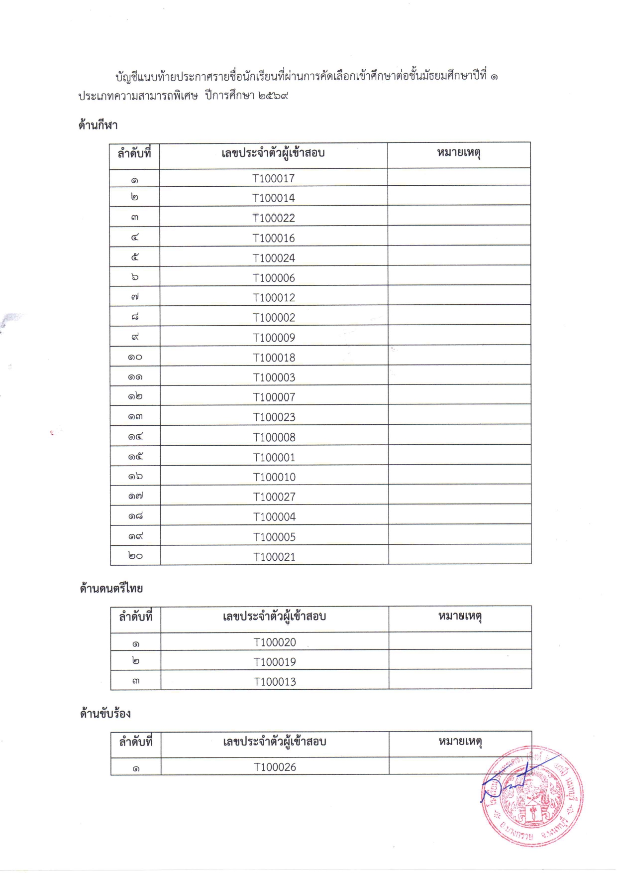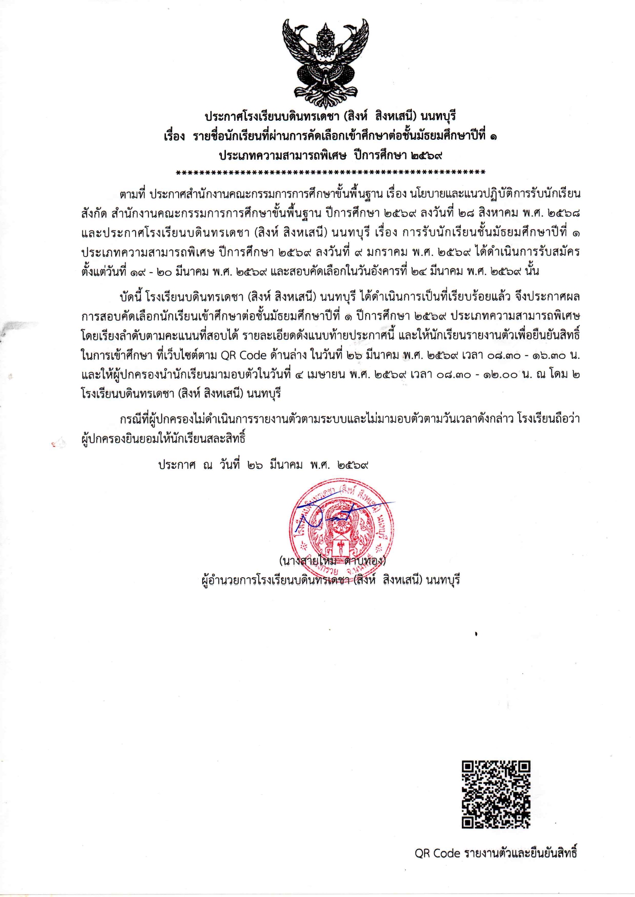 รายชื่อนักเรียนที่ผ่านการคัดเลือกเข้าศึกษาต่อชั้นมัธยมศึกษาปีที่ 1 ประเภทความสามารถพิเศษ 2569