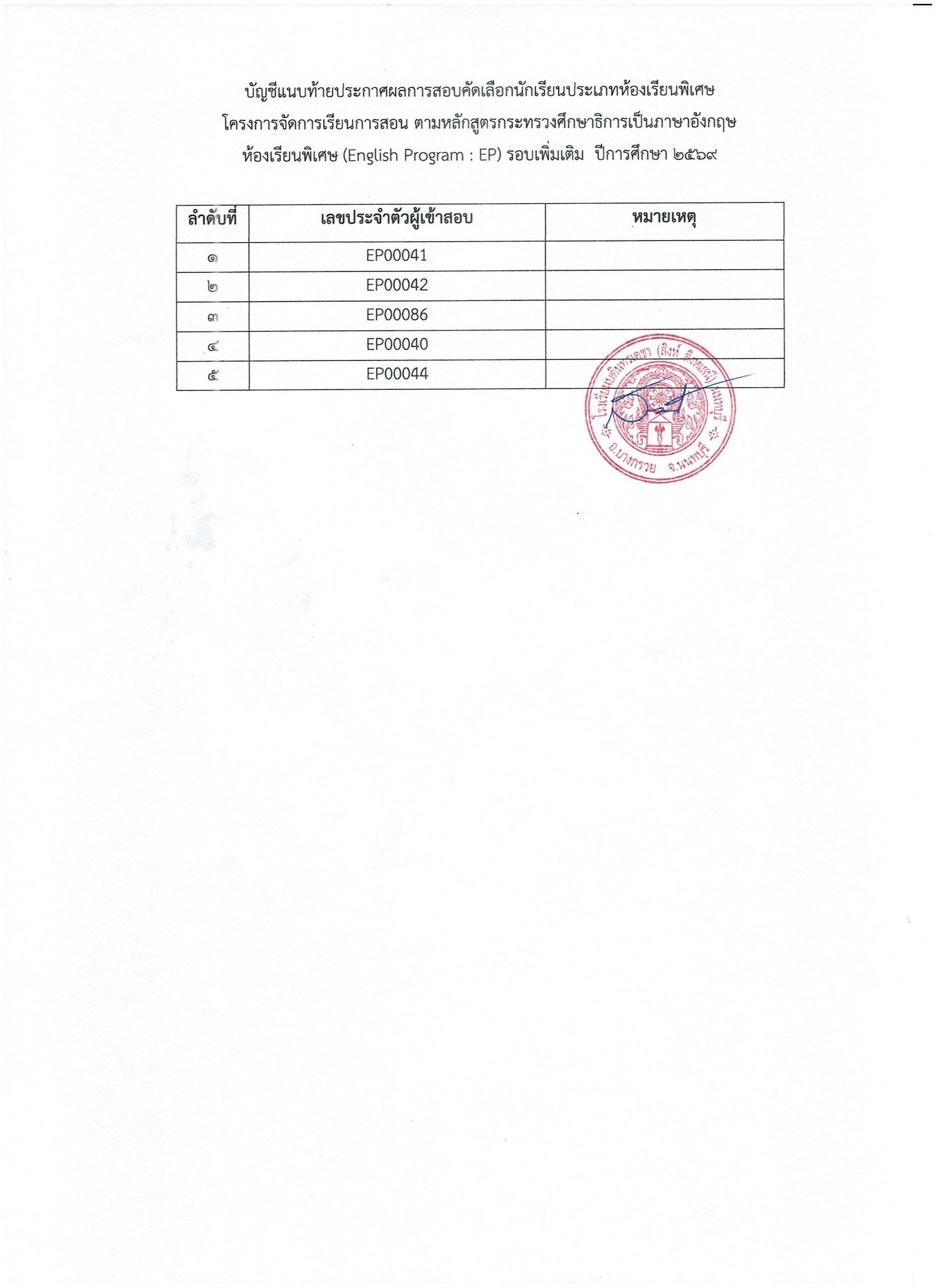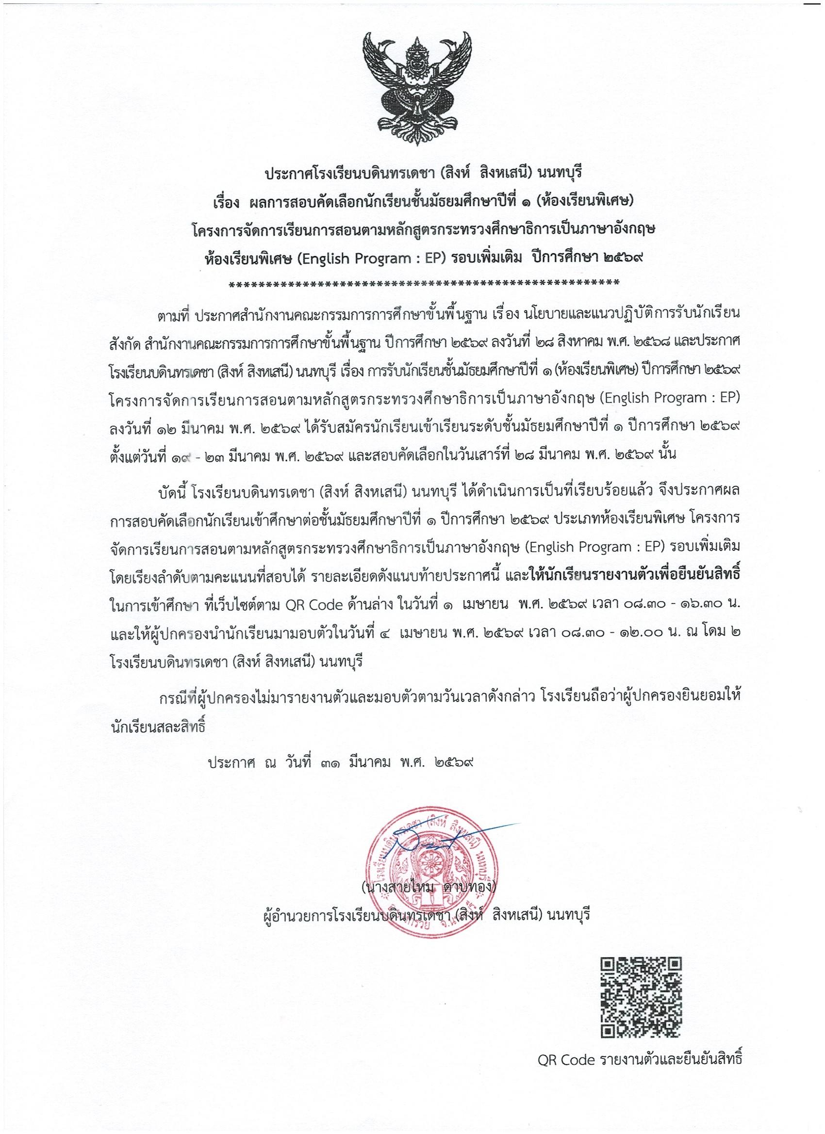 ผลการสอบคัดเลือกนักเรียนชั้นมัธยมศึกษาปีที่ 1 (ห้องเรียนพิเศษ) EP รอบเพิ่มเติม ปีการศึกษา 2569