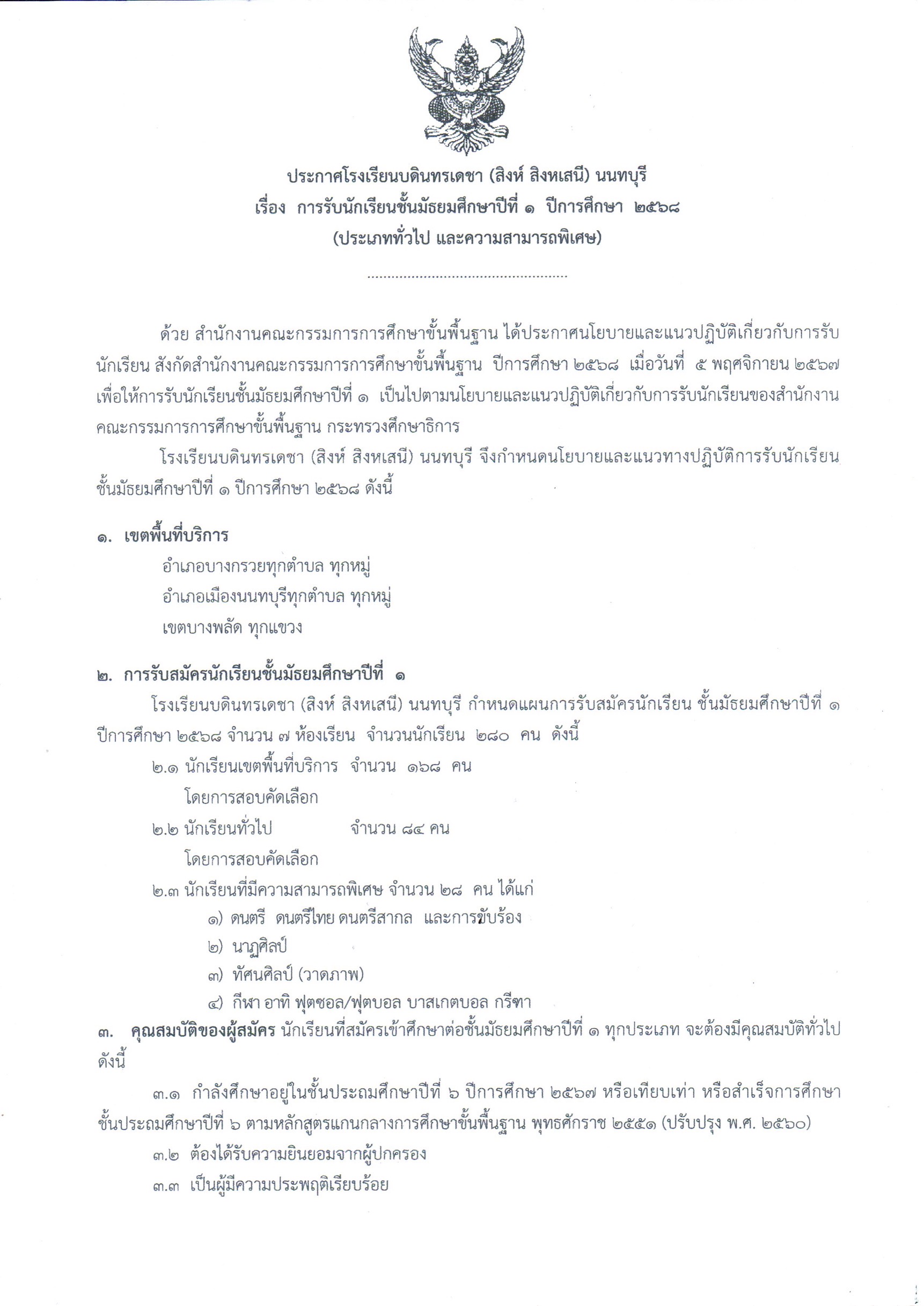 ประกาศ เรื่อง การรับสมัครนักเรียนชั้นมัธยมศึกษาปีที่ 1 ปีการศึกษา 2568
