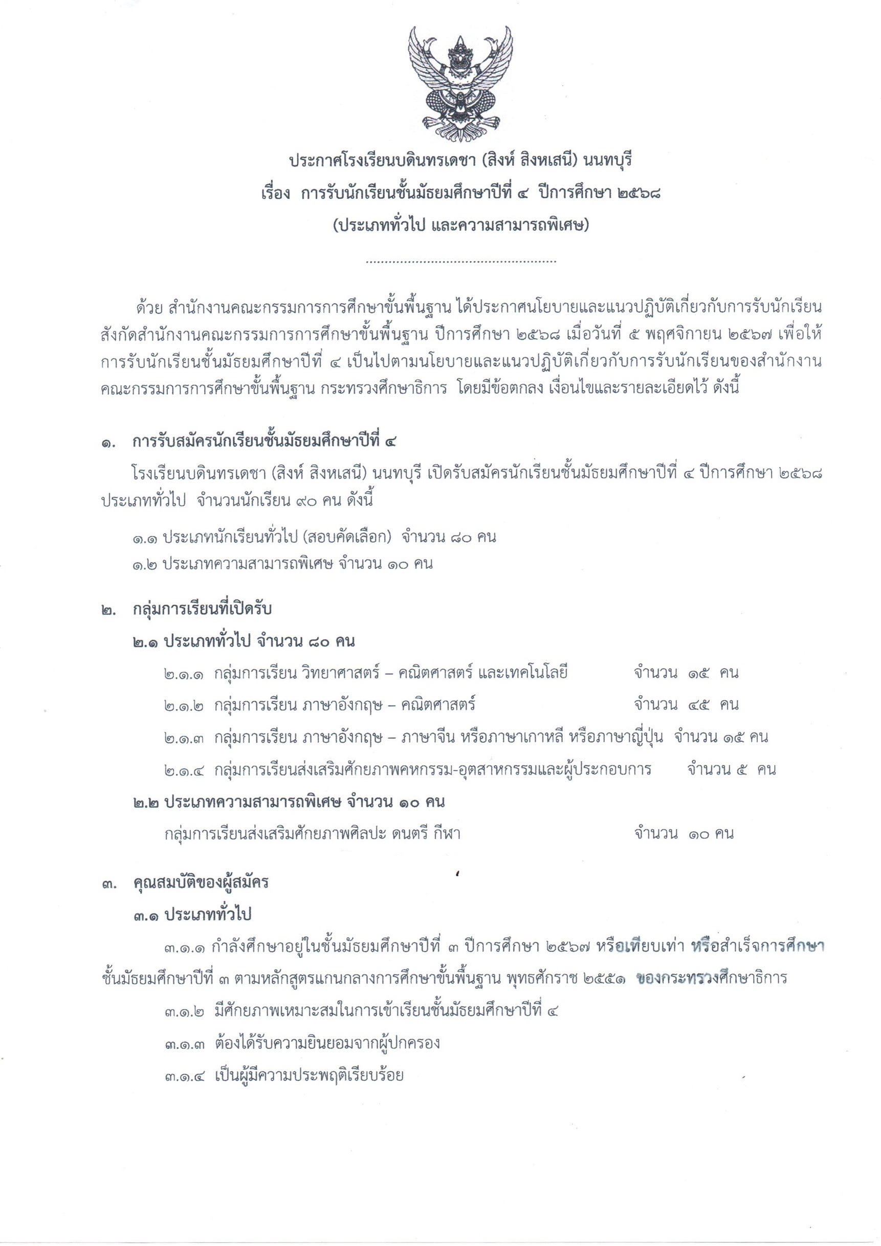 ประกาศ เรื่อง การรับสมัครนักเรียนชั้นมัธยมศึกษาปีที่ 4 ปีการศึกษา 2568