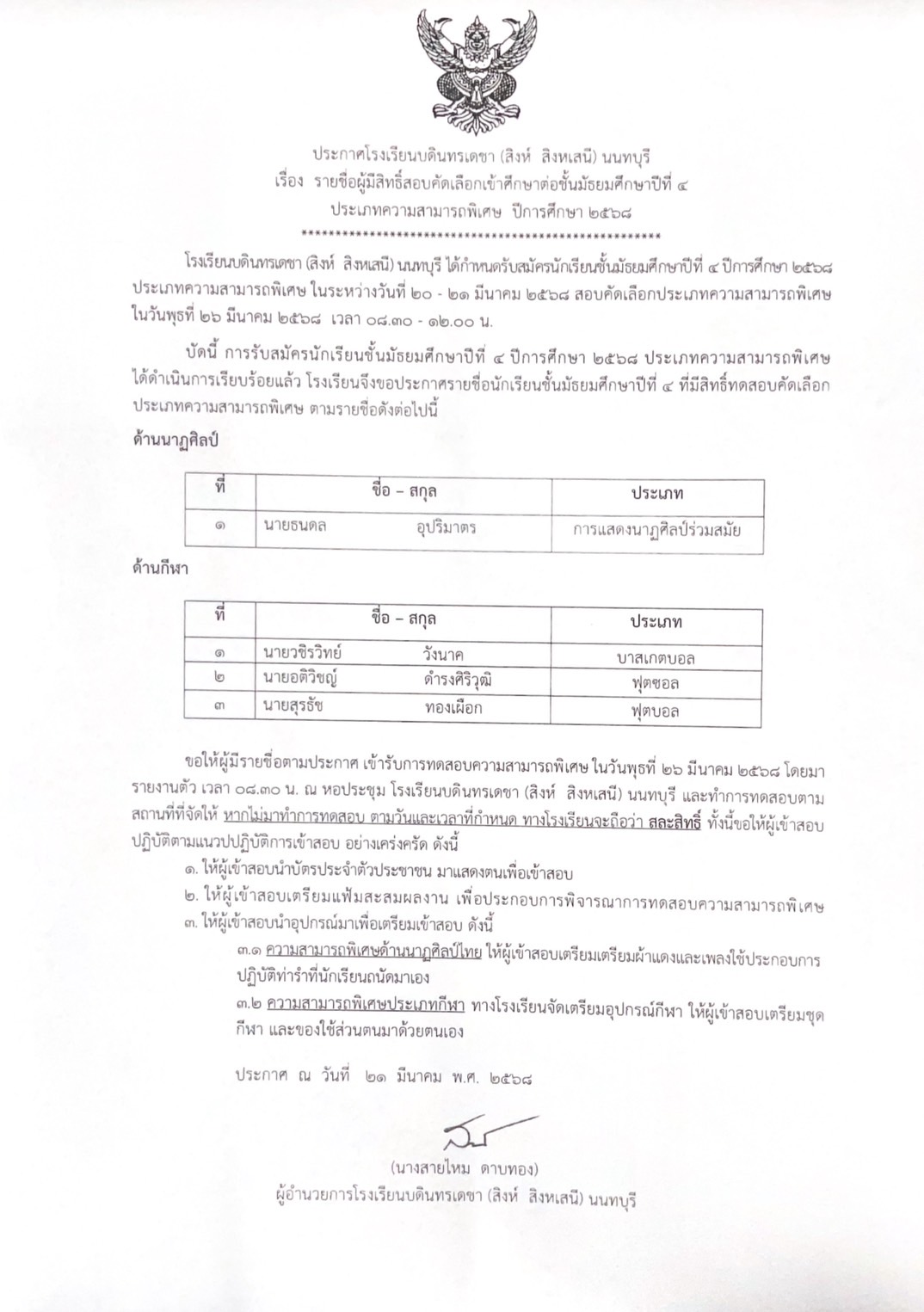 ประกาศ รายชื่อผู้มีสิทธิ์สอบคัดเลือกเข้าศึกษาต่อ ชั้นมัธยมศึกษาปีที่ ๔ ประเภทความสามารถพิเศษ ๒๕๖๘