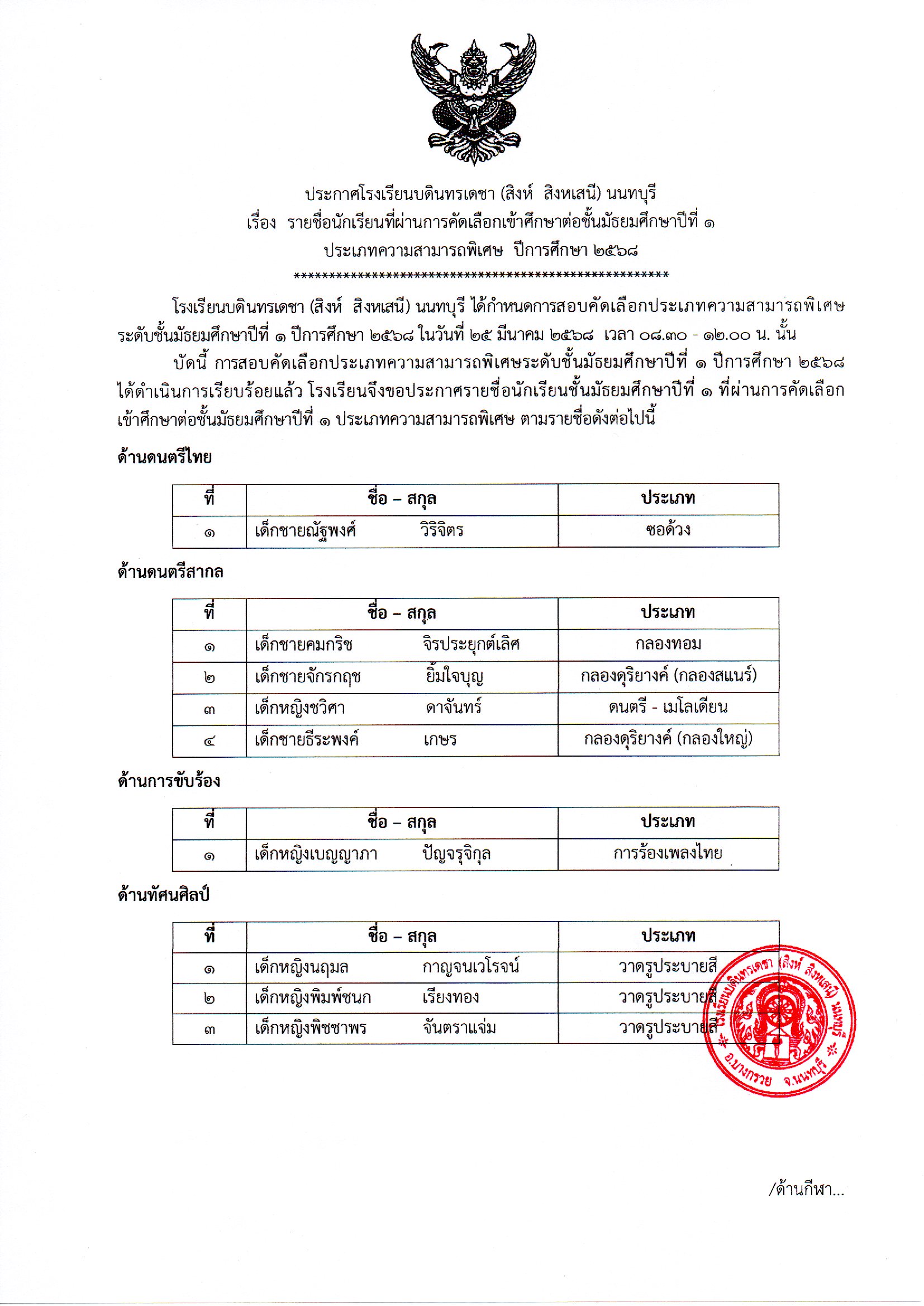 ประกาศรายชื่อนักเรียนที่ผ่านการคัดเลือกเข้าศึกษาต่อชั้นมัธยมศึกษาปีที่ 1 ประเภทความสามารถพิเศษ 2568